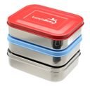 - Stainless Uno, 3-section Red Trio, 4-section Sky Blue Quad; 6" x 5" x 1.75" each; capacity: 20 fl. oz./600 ml each
